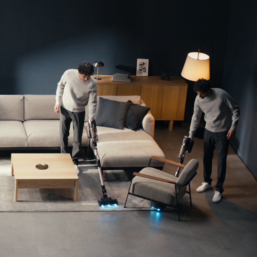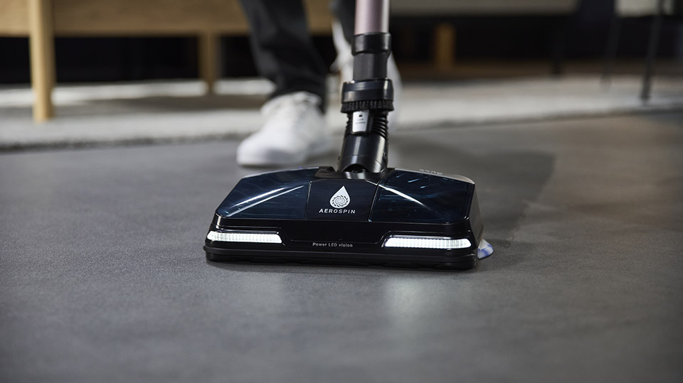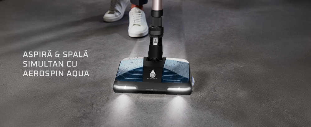 Aspiri si speli simultan praful sau petele uscate de pe podelele dure (precum parchet sau gresie) cu capatul cu lavete rotative Aerospin Aqua*.