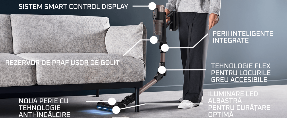 Motorul de ultima generatie ofera o putere extrema de aspirare de pana la 315 Air Watts pentru a face fata oricarui tip de murdarie dintr-o singura miscare.